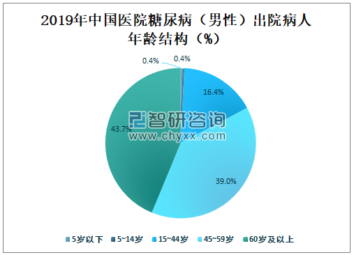 2019年中国医院60岁及以上上糖尿病(男性)出院病人占全国糖尿病(男性)总出院病人的43.7%,占比最大;45~59岁上糖尿病(男性)出院病人占全国糖尿病(男性)总出院病人的39.0%;15~44岁上糖尿病(男性)出院病人占全国糖尿病(男性)总出院病人的16.4%;5~14岁上糖尿病(男性)出院病人占全国糖尿病(男性)总出院病人的0.4%;5岁以下上糖尿病(男性)出院病人占全国糖尿病(男性)总出院病人的0.4%。