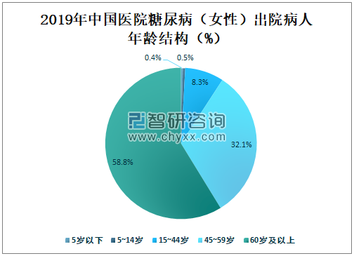 2019年中国医院60岁及以上糖尿病(女性)出院病人占全国糖尿病(女性)总出院病人的58.8%,占比最大;45~59岁糖尿病(女性)出院病人占全国糖尿病(女性)总出院病人的32.1%;15~44岁糖尿病(女性)出院病人占全国糖尿病(女性)总出院病人的8.3%;5~14岁糖尿病(女性)出院病人占全国糖尿病(女性)总出院病人的0.5%;5岁以下糖尿病(女性)出院病人占全国糖尿病(女性)总出院病人的0.4%。