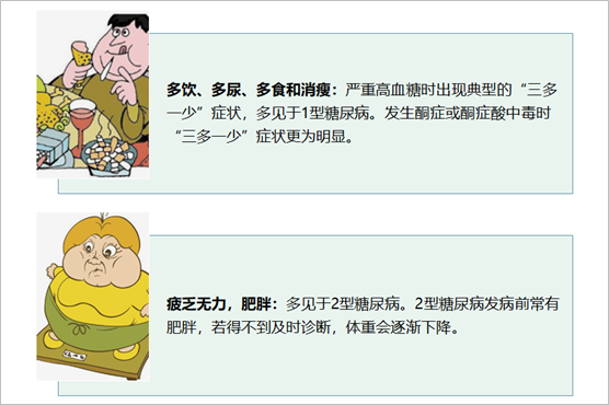 糖尿病的主要临床症状有多饮、多尿、多食、消瘦以及疲乏无力。