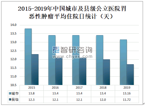 2019年中国城市公立医院胃恶性肿瘤平均住院日为13.16天,较2018年减少了0.2天;2019年中国县级公立医院胃恶性肿瘤平均住院日为11.72天,较2018年减少了0.3天。