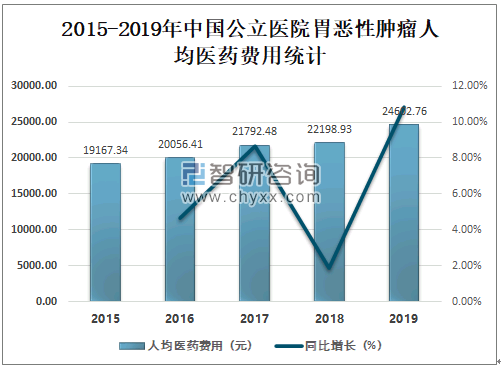 2015-2019年中国公立医院胃恶性肿瘤人均医药费用统计