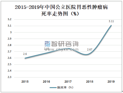 2019年中国公立医院胃恶性肿瘤病死率为3.11%,较2018年增长了0.44%。