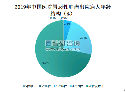 2019年中国医院60岁及以上胃恶性肿瘤出院病人占全国胃恶性肿瘤总出院病人的71.9%,占比最大;45~59岁胃恶性肿瘤出院病人占全国胃恶性肿瘤总出院病人的23.4%;15~44岁胃恶性肿瘤出院病人占全国胃恶性肿瘤总出院病人的4.3%;5岁以下胃恶性肿瘤出院病人占全国胃恶性肿瘤总出院病人的0.4%。