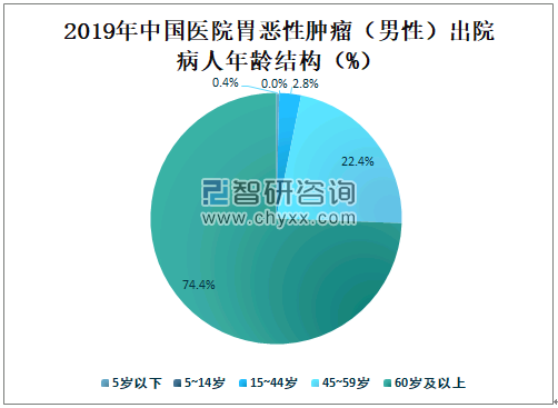 2019年中国医院60岁及以上胃恶性肿瘤(男性)出院病人占全国胃恶性肿瘤(男性)总出院病人的74.4%,占比最大;45~59岁胃恶性肿瘤(男性)出院病人占全国胃恶性肿瘤(男性)总出院病人的22.4%;15~44岁胃恶性肿瘤(男性)出院病人占全国胃恶性肿瘤(男性)总出院病人的2.8%;5岁以下胃恶性肿瘤(男性)出院病人占全国胃恶性肿瘤(男性)总出院病人的0.4%。