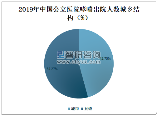 2019年中国城市公立医院哮喘出院人数占总出院人数的45.75%;2019年中国县级公立医院哮喘出院人数占总出院人数的54.27%。