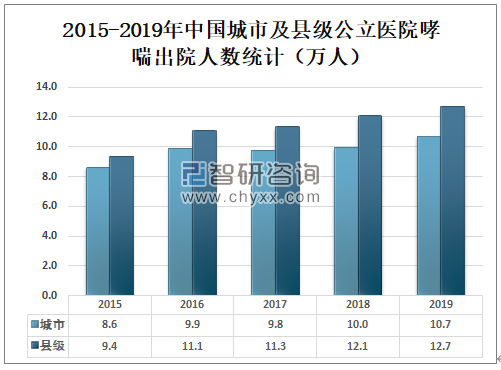 2019年中国城市公立医院哮喘出院人数为10.7万人,较2018年增加了0.8万人;2019年中国县级公立医院哮喘出院人数为12.7万人,较2018年增加了0.6万人。