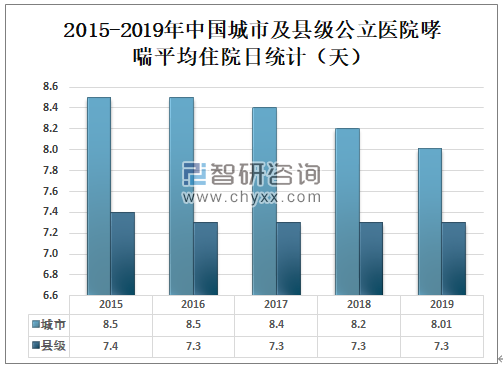2015-2019年中国城市及县级公立医院哮喘平均住院日统计