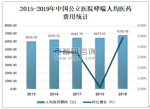中国公立医院哮喘人均医药费用逐年增加,2019年中国公立医院哮喘人均医药费用为6790.48元,较2018年增加了317.07元,同比增长4.9%。