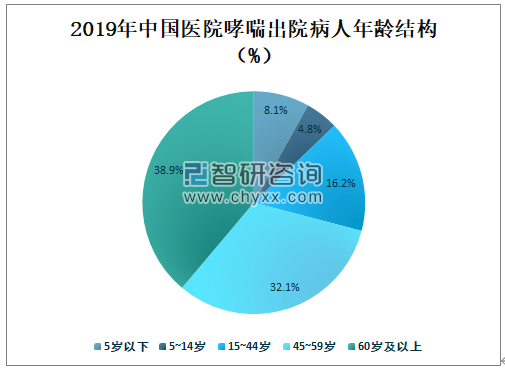 2019年中国医院60岁及以上哮喘出院病人占全国哮喘总出院病人的38.9%,占比最大;45~59岁哮喘出院病人占全国哮喘总出院病人的32.1%;15~44岁哮喘出院病人占全国哮喘总出院病人的16.2%;5岁以下哮喘出院病人占全国哮喘总出院病人的8.1%;5~14岁哮喘出院病人占全国哮喘总出院病人的4.8%。