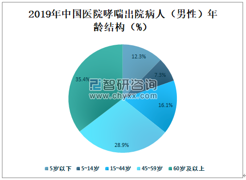 2019年中国医院60岁及以上哮喘出院病人(男性)占全国哮喘总出院病人(男性)的35.4%,占比最大;45~59岁哮喘出院病人(男性)占全国哮喘总出院病人(男性)的28.9%;15~44岁哮喘出院病人(男性)占全国哮喘总出院病人(男性)的16.1%;5岁以下哮喘出院病人(男性)占全国哮喘总出院病人(男性)的12.3%;5~14岁哮喘出院病人(男性)占全国哮喘总出院病人(男性)的7.3%。