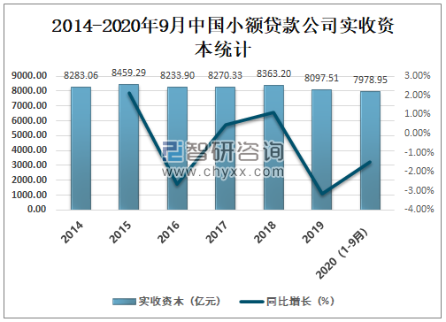 智研咨询发布的《2021-2027年中国小额贷款行业市场竞争态势及未来趋势预测报告》数据显示:2016年中国小额贷款公司实收资本逐年下滑,2019年中国小额贷款公司实收资本为8097.51亿元,较2018年减少了265.69亿元,同比减少3.18%,2020年截止到9月中国小额贷款公司实收资本为7978.95亿元。