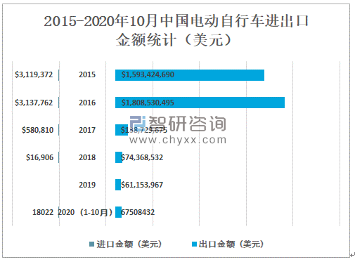 2020年1-10月中国电动自行车进口金额为18022美元,出口金额为67508432美元。