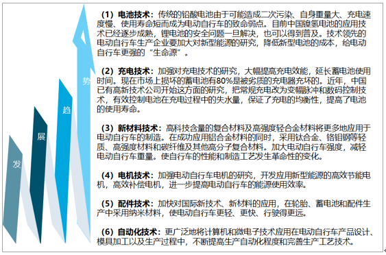 未来中国电动自行车技术发展主要包含电池技术、充电技术、新材料技术、电机技术、配件技术和自动化技术六个方面。