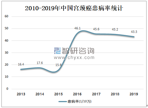 近几十年宫颈细胞学筛查的普遍应用,使宫颈癌和癌前病变得以早期发现和治疗,2017年开始中国宫颈癌患病率逐年下降,2019年中国宫颈癌患病率为43.3/10万,较2018年减少了1.9/10万。
