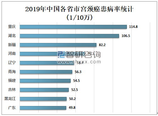 2019年重庆宫颈癌患病率为114.8/10万,全国排名第一;湖北宫颈癌患病率为106.5/10万,全国排名第二;新疆宫颈癌患病率为82.2/10万,全国排名第三。