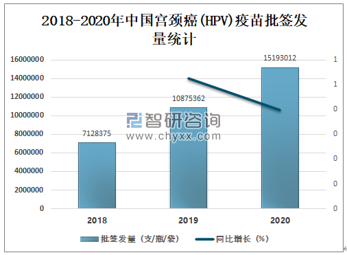 HPV疫苗已经被证实了对HPV感染和宫颈癌前病变的高疫苗效力,已经大范围在大多数高收入国家中使用。在中低收入国家,由于疫苗的高成本和物流,社会和文化因素,及对病毒的了解和认识不足,也导致疫苗接种率低。终极的疫苗将是便宜,副作用小,提供终身免疫力和预防更多种HPV类型。英国已将免疫接种延伸至青少年男孩,在英格兰12岁男孩在学校开始接受HPV疫苗免疫接种,就像女孩和年轻女性一样,疫苗将免费提供到他们年满18岁。2020年中国宫颈癌(HPV)疫苗批签发量达15193012支/瓶/袋,较2019年增加了4317650支/瓶/袋,同比增长39.7%,预计未来将继续保持增长。