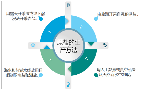 原盐生产有四种方法:①用露天开采法或地下溶浸法开采岩盐。②由盐湖开采自沉积湖盐。③海水和盐湖水经盐田日晒制取海盐和湖盐。④用人工熬煮或真空蒸法从天然卤水中制取。中国原盐资源丰富,有海盐、四川自贡的井盐,青海茶卡的湖盐,贵州、云南的岩盐。世界各国根据本国的资源情况生产原盐,1982年世界原盐产量约165Mt。原盐作为化学工业用的原料,必须进行处理。处理方法是将原盐加水配成一定浓度的盐水,其中机械杂质可用澄清和过滤的方法除去,化学杂质则根据要求用加化学药剂的方法除去。例如纯碱工业中的盐水精制,用石灰、纯碱法或石灰、氨、二氧化碳法除去Ca、Mg等杂质;氯碱工业用烧碱、氯化钡、纯碱的方法除去盐水中Ca、Mg、SO等杂质。