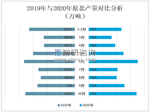 从月度数据来看,2020年1-10月中国原盐产量均低于2019年,2020年10月原盐产量为692万吨,较2019年同期减少了24.1万吨。