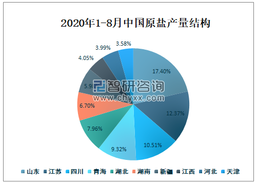 中国原盐生产主要有集中在山东、江苏、四川、青海、湖北、湖南、新疆、江西、河北、天津等,2020年1-8月山东、江苏、四川、青海、湖北、湖南、新疆、江西、河北、天津十个省市原盐产量占全国总产量的81.87%。其中山东原盐产量占全国总产量的17.40%,占比最大,其次是江苏和四川。