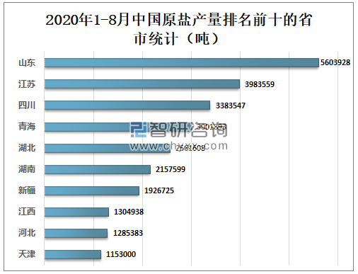 2020年1-8月山东原盐产量为5603928吨,全国排名第一;江苏原盐产量为3983559吨,全国排名第二;四川原盐产量为3383547吨,全国排名第三。
