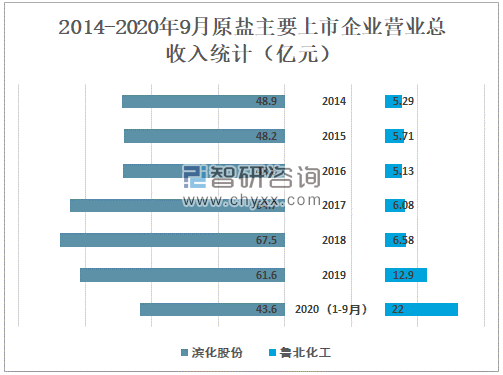 2014-2020年9月原盐主要上市企业营业总收入统计(亿元)