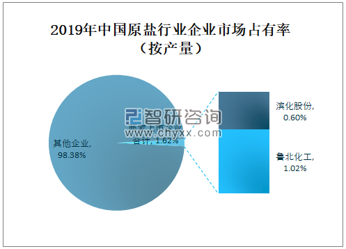 2019年滨化股份原盐产量占全国原盐总产量的0.60%;鲁北化工原盐产量占全国原盐总产量的1.02%。2019年滨化股份和鲁北化工两家上市企业原盐产量仅占全国原盐总产量的1.62%,企业市场占有率非常低,市场竞争非常激烈。
