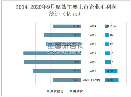 2014-2020年9月原盐主要上市企业毛利润统计(亿元)