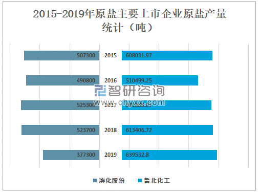 2019年滨化股份原盐产量为377300吨,鲁北化工原盐产量为639532.8吨。