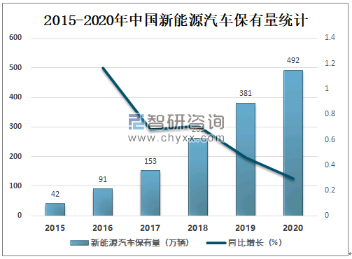 新能源汽车市场增长迅速,2020年中国新能源汽车保有量达492万辆,较2019年增了111万辆,同比增长29.13%,新能源汽车增量连续三年超过100万辆,呈持续高速增长趋势。
