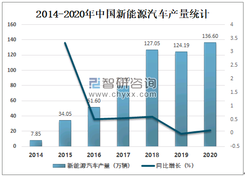 虽然2020年中国汽车整体产量有所下滑,但新能源汽车产量却在增加,2020年中国新能源汽车产量达136.6万辆,较2019年增加了12.41万辆,同比增长9.99%,未来市场发展可期。