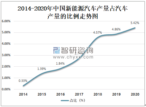 自2014年以来中国新能源汽车产量占汽车产量的比例逐年攀升,2020年中国新能源汽车产量占汽车产量的5.42%,较2019年增长了0.55%,预计未来将继续保持增长。