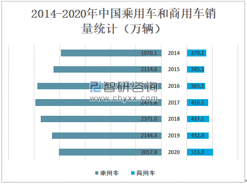 2020年中国乘用车销量为2017.8万辆,较2019年减少了126.6万辆;商用车销量为513.3万辆,较2019年增加了80.9万辆。