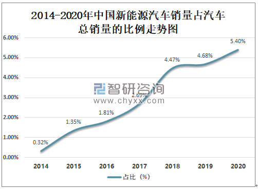2014-2020年中国新能源汽车销量占汽车总销量的比例走势图