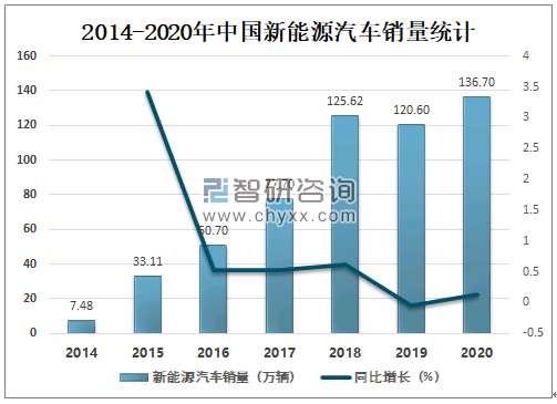 新能源汽车采用非常规的车用燃料作为动力来源的汽车,这样就降低了传统石油资源的消耗,站在环保的角度,新能源汽车将成为未来汽车行业发展的主导方向。2020年中国新能源汽车销量达136.70万辆,较2019年增加了16.1万辆,同比增长13.35%。