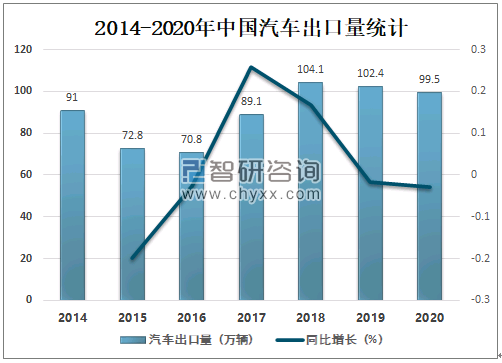 2020年受海外疫情影响,汽车出口有所下滑,2020年中国汽车出口量为99.5万辆,较2019年减少了2.9万辆,同比减少2.83%。