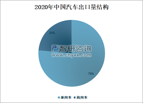 2020年中国乘用车出口量为76万辆,占汽车总出口量的76.38%;商用车出口量为23.5万辆,占汽车总出口量的23.62%。