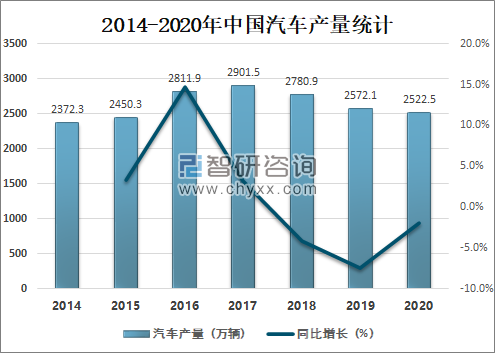 智研咨询发布的《2021-2027年中国汽车行业竞争格局分析及投资前景规划报告》数据显示:自2018年以来中国汽车产量开始下滑,2020年中国汽车产量为2522.5万辆,较2019年少了30.3万辆,同比减少1.19%。