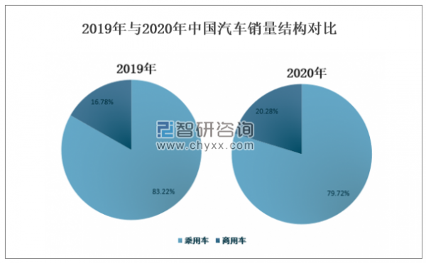 2020年中国乘用车销量占汽车总销量的79.72%,占比虽然较大,但较2019年有所下滑;商用车销量占汽车总销量的20.28%,较2019年有所提升。