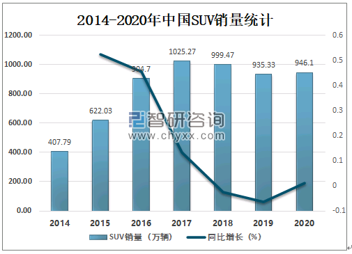 自2018年以来中国SUV产量逐年下滑,2019年中国SUV产量为934.44万辆,较2018年减少了61.41万辆,2020年中国有所回升,2020年中国SUV产量为939.8万辆,较2019年增加了5.36万辆,同比增长0.57%。SUV的发展虽然经历了高低起伏的几个阶段,但作为汽车市场重要的一支力量,SUV市场竞争尚未充分,无论是从产品自身还是厂家对市场的开发,市场容量还远未到达极限,依然有很大的提升空间。