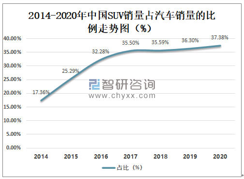自2014年以来中国SUV销量占汽车销量的比例逐年增加,2017年开始增速有所放缓,但依然保持增长趋势,2020年中国SUV销量占汽车销量的37.38%,较2019年增长了1.08%。