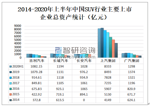 中国SUV上市企业主要有吉利汽车、长城汽车、长安汽车、上汽集团、广汽集团等。2020年上半年吉利汽车总资产为1082.15亿元;长城汽车总资产为1194亿元;长安汽车总资产为1028亿元;上汽集团总资产为8333亿元;广汽集团总资产为1298亿元。