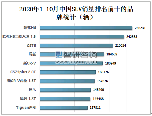 智研咨询发布的《2021-2027年中国SUV行业市场全景调查及发展趋势研究报告》数据显示:2020年1-10月哈弗H6产量为260725辆,全国排名第一;哈弗H6二驱汽油1.5产量为239031辆,全国排名第二;CS75产量为203336辆,全国排名第三。