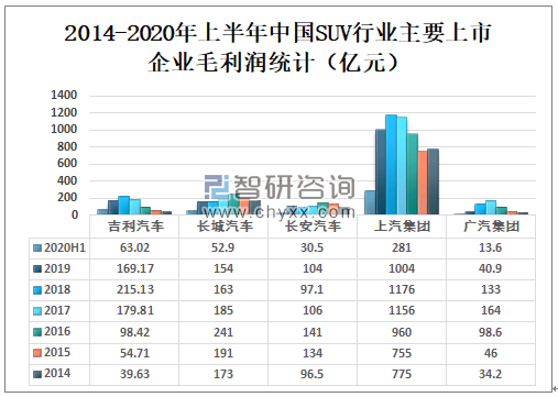 2014-2020年上半年中国SUV行业主要上市企业毛利润统计(亿元)