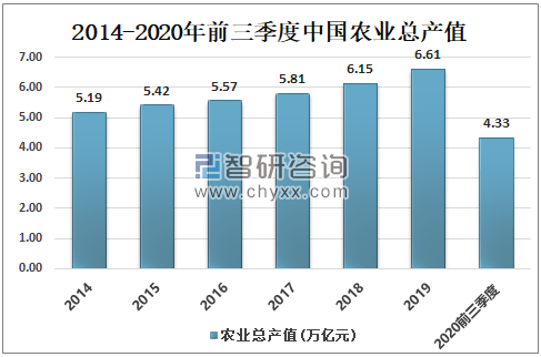 中国是一个基础农业大国,近年来,中国农业生产、农村基础建设、农民安全用水以及农村环境保护等快速发展,带动了国内各种农业机械行业发展,也带动了国内节水灌溉类机械行业的快速发展。2019年中国农业生产总值为6.61万亿元,2020前三季度中国农业生产总值为4.33万亿元。