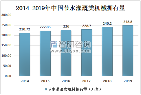 节水灌溉装备在提高农业用水效率、农民增产增收及生态环境建设等方面发挥着重要作用,对于缓解水资源短缺矛盾、保证国家粮食安全、推动农村经济可持续发展具有重要的战略地位。2014-2019年中国节水灌溉类机械拥有量呈平稳式增长,2019年中国节水灌溉类机械拥有量为248.8万套,较2018年的240.2万套同比增长3.58%。