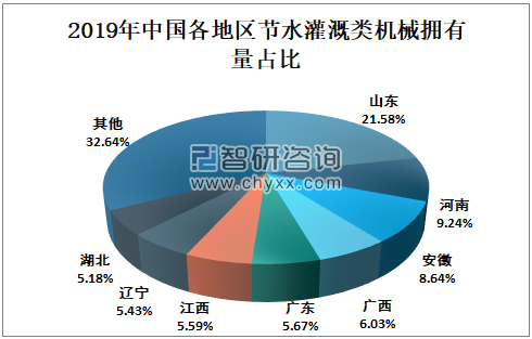 智研咨询发布的《2021-2027年中国农业机械行业市场竞争现状及发展趋势分析报告》数据显示:2019年山东节水灌溉类机械拥有量占全国总拥有量的21.58%,河南节水灌溉类机械拥有量占全国总拥有量的9.24%,安徽节水灌溉类机械拥有量占全国总拥有量的8.64%。