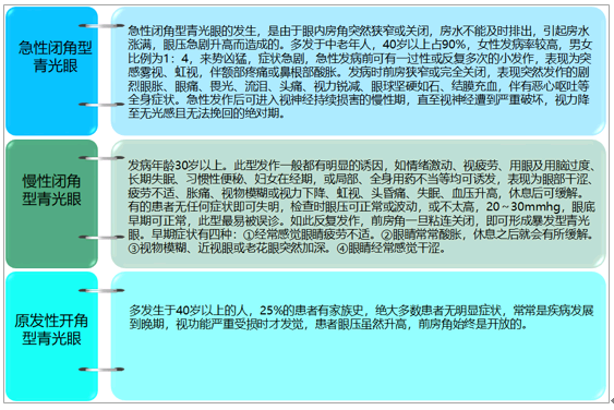 原发性青光眼根据眼压升高时前房角的状态,分为闭角型青光眼和开角型青光眼,闭角型青光眼又根据发病急缓,分为急性闭角型青光眼和慢性闭角型青光眼。