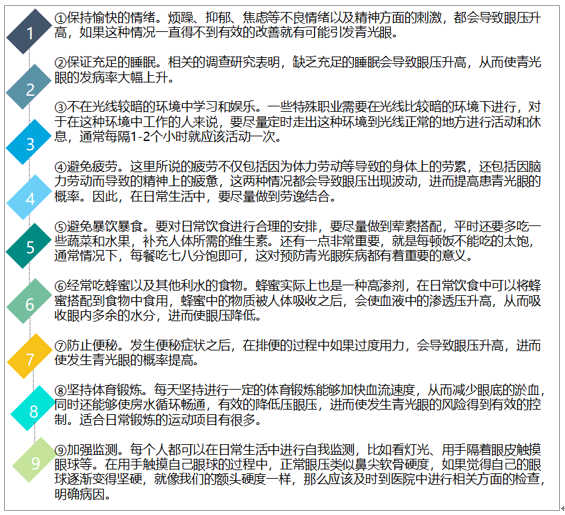 生活中预防青光眼的措施主要有保持愉快的情绪、保证充足的睡眠、不在光线较暗的环境中学习和娱乐、避免疲劳、避免暴饮暴食、经常吃蜂蜜以及其他利水的食物、防止便秘、坚持体育锻炼、加强监测等。