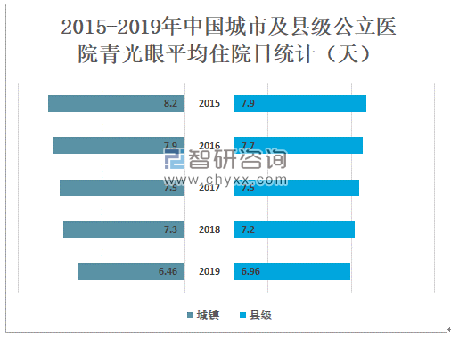 2019年中国城镇公立医院青光眼平均住院日为6.46天,较2018年减少了0.84天;县级公立医院青光眼平均住院日为6.96天,较2018年减少了0.24天。