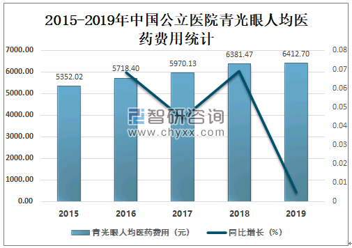 2019年中国公立医院青光眼人均医药费用为6412.7元,较2018年减少了31.23元,同比增长0.49%。